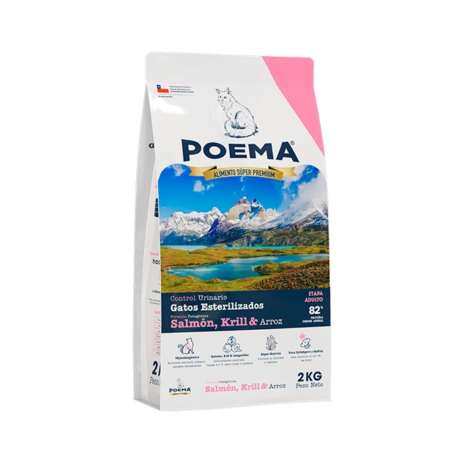 Poema para gatos esterilizados elaborado con ingredientes de alta calidad de proveedores chilenos seleccionados para lograr una fórmula balanceada y de excelente digestibilidad para que tu gato tenga músculos sanos y fuerte, un pelaje brillante y un aliento sano. Con salmón hidrolizado que garantiza un alimento de calidad super premium. Esta excelente fórmula ayuda a regular el pH urinario entre 6.2 y 6.3 evitando la formación de cálculos en las vías urinarias.